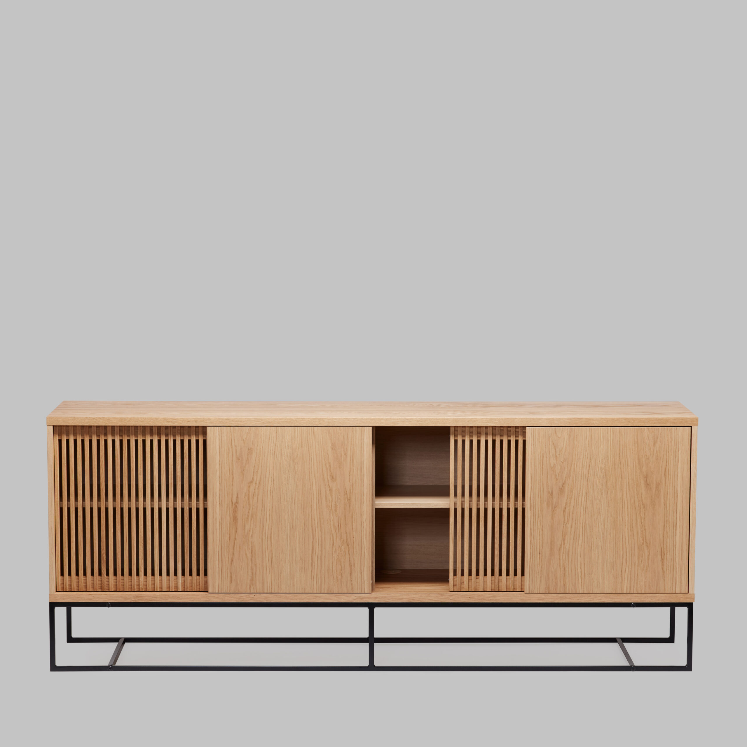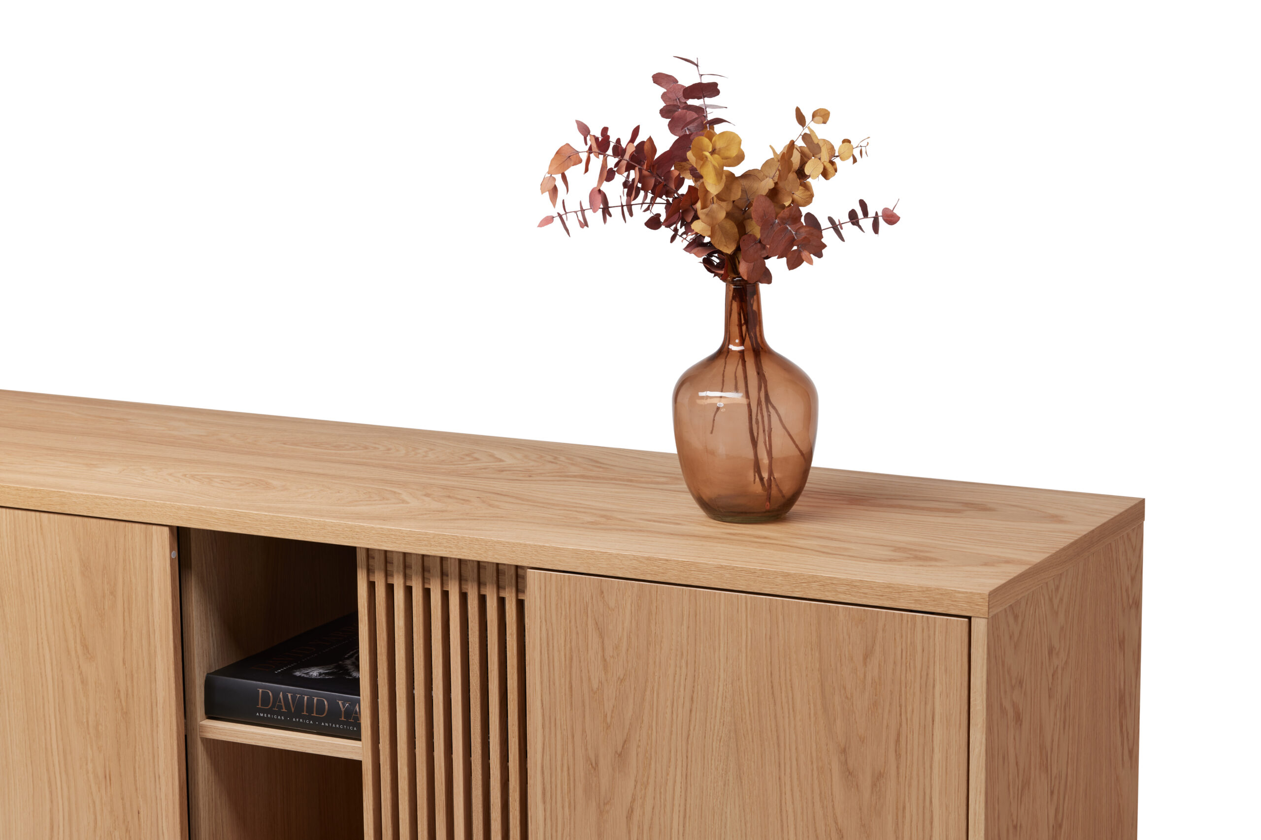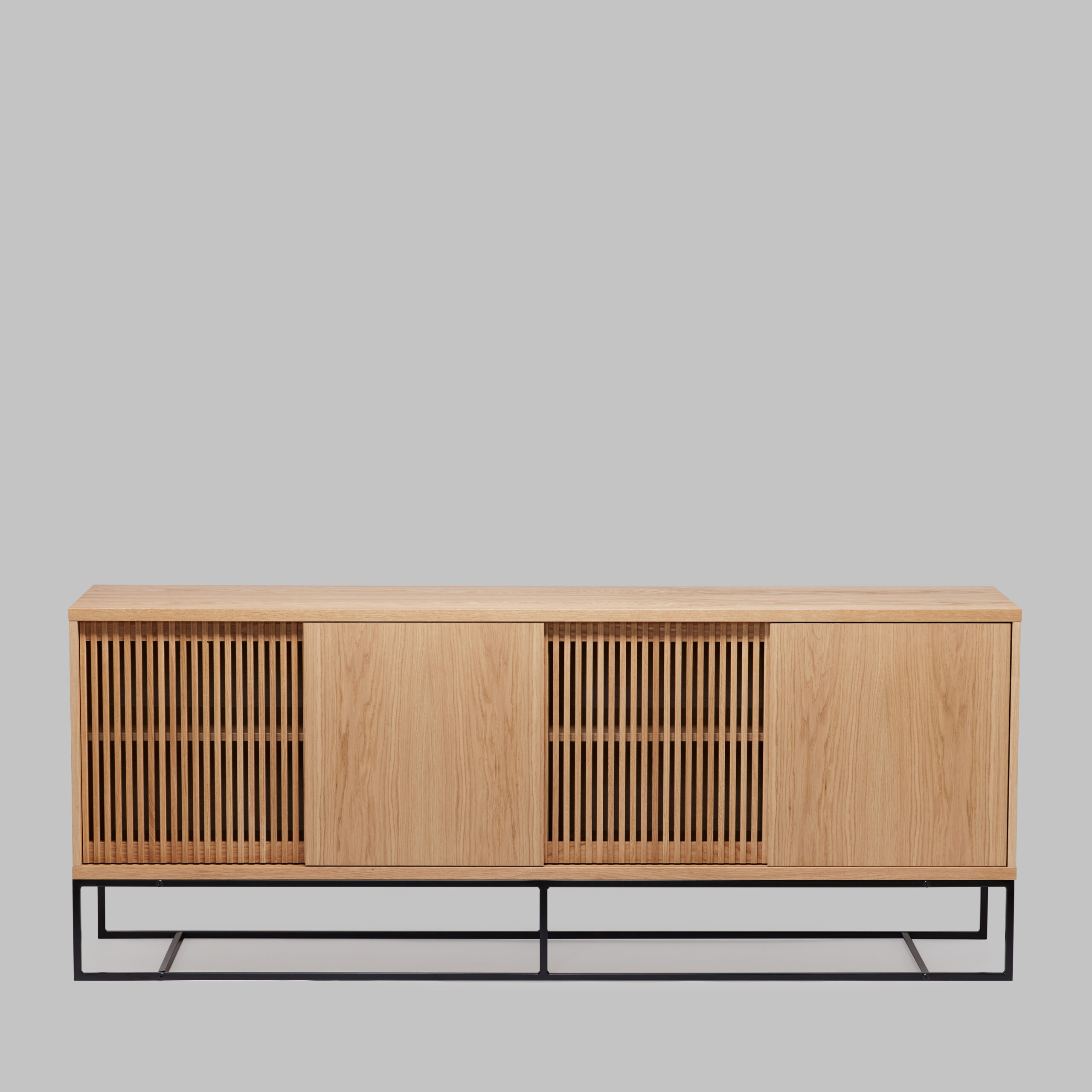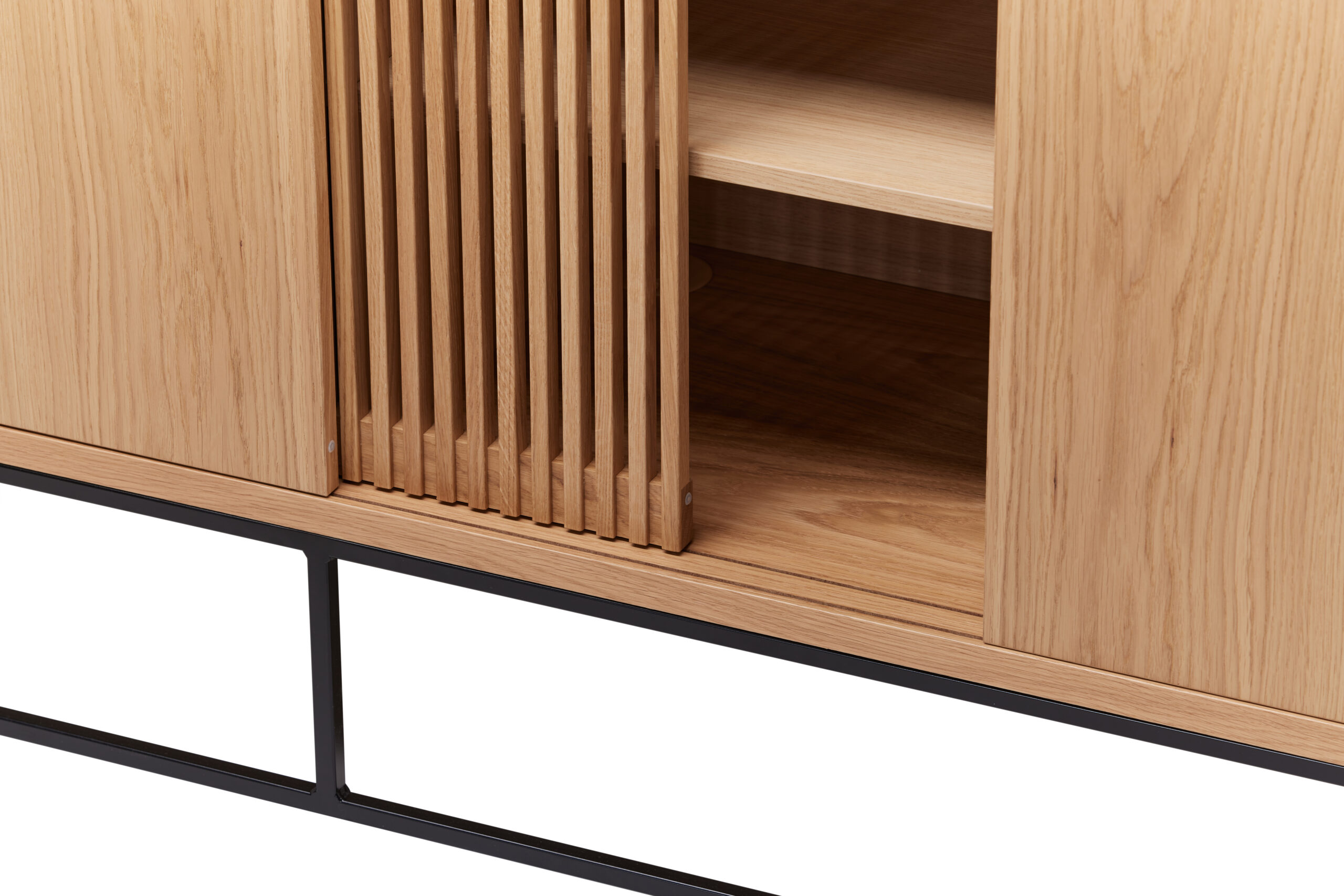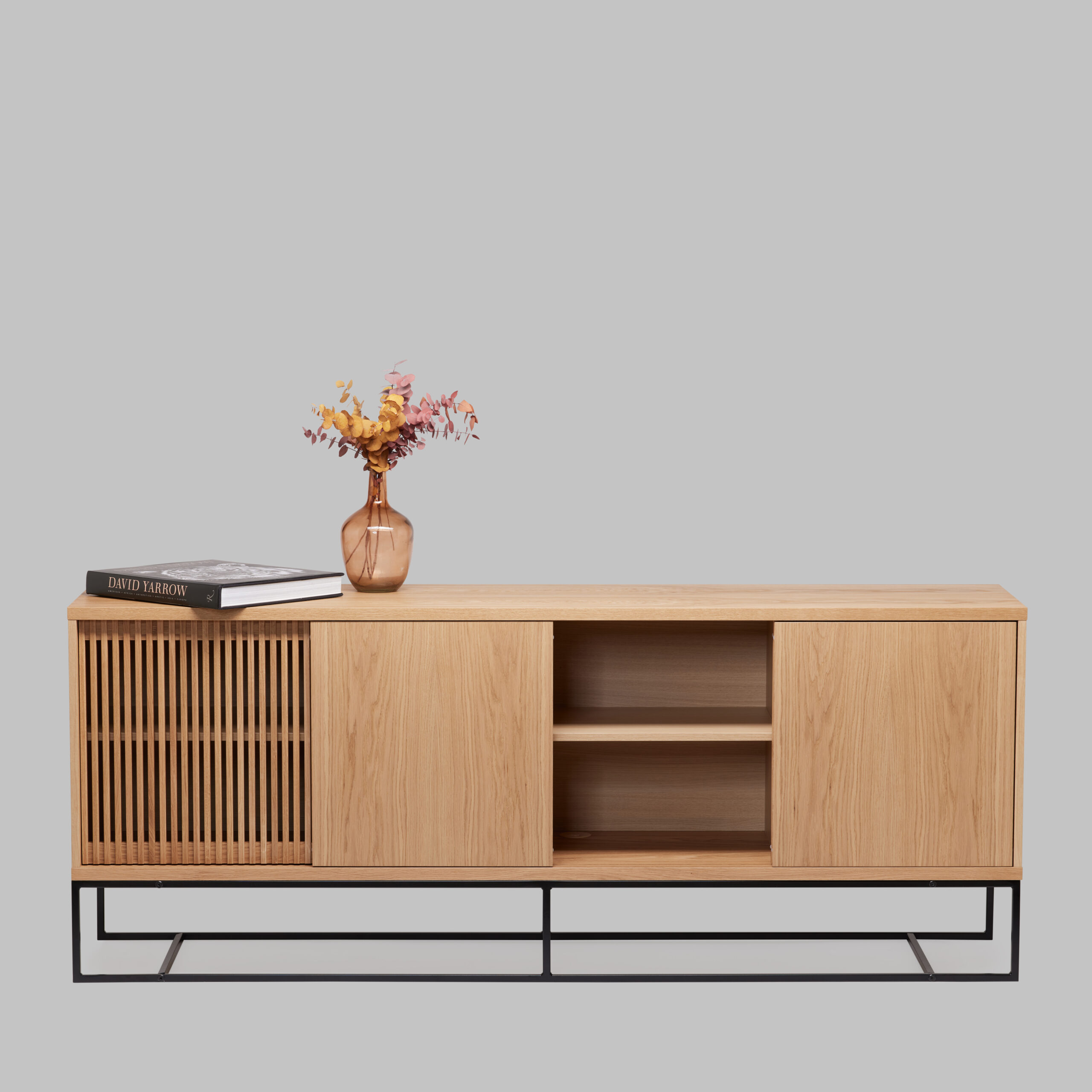 Kummutil on neli liugust – kaks neist on valmistatud massiivsest tammpuidust ning neil on stiilsed ribimustriga uksed, samas kui ülejäänud kaks on tammespooniga kaetud puitlaastplaadist. See kombinatsioon loob ainulaadse ja elegantse välimuse, sobitudes suurepäraselt nii kaasaegsesse kodusse kui ka stiilsesse kontorisse.