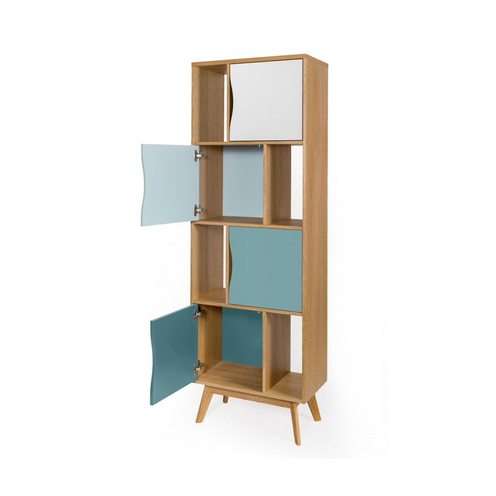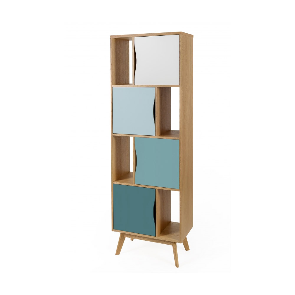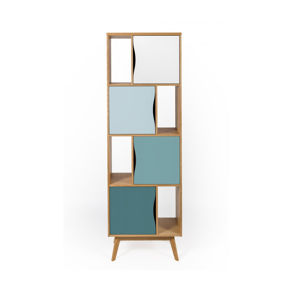Osaliselt avatud tamme-täispuidust jalgadega raamaturiiul. Alus ja välimine raam on tehtud tammespoonist. Uksed ja tagasein värvitud puitkiudplaadist (MDF). Värvid: “Kuusk” – valge ja erinevad helesinised värvid. Riiulil on neli panipaika, millest igaüks on 40 cm kõrge ja 40 cm lai. Lahtise riiuli laius on 19,5cm. Uksehinged ja kõik liitmikud on valmistatud metallist. Riiuli kõrgus põrandast on 15cm. Toode vajab kindlasti seinakinnitust. Tüüblid ja poldid ei kuulu toote juurde.