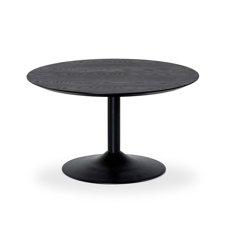 Ümar diivanilaud Miles, mille pealmine osa on valmistatud vastupidavast laminaadist ja laua jalg kvaliteetsest metallist.