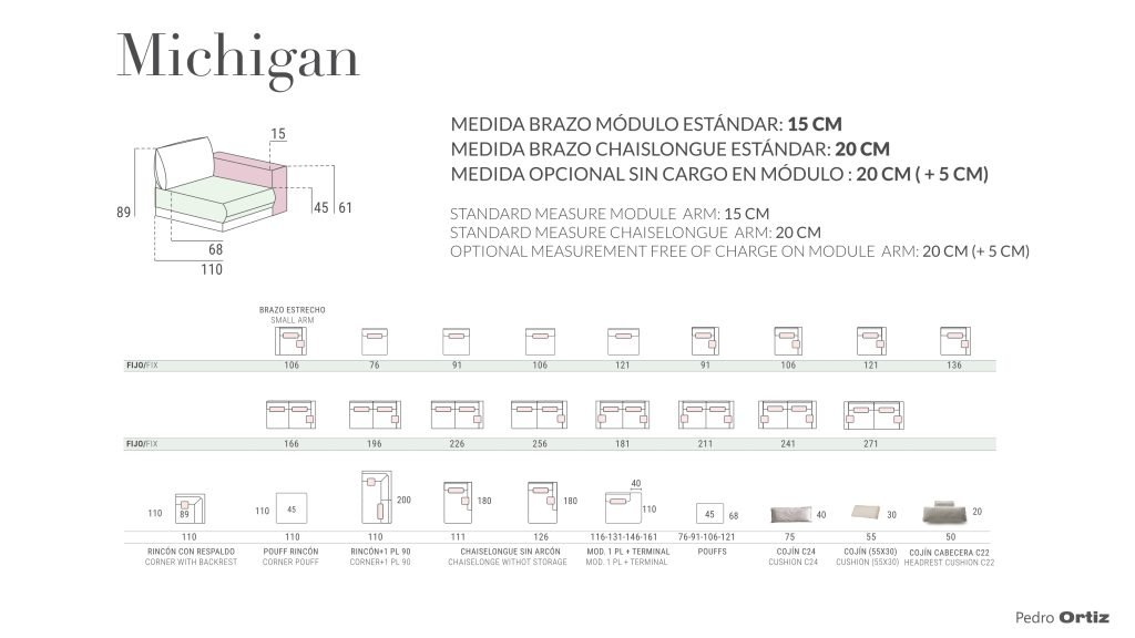 Pedro Ortiz’i Michigan diivan on ideaalne valik neile, kes hindavad kaasaegset disaini ja kõrget kvaliteeti. See mudel ühendab endas elegantse välimuse ja praktilise mugavuse, olles samas täielikult kohandatav vastavalt Sinu eelistustele.