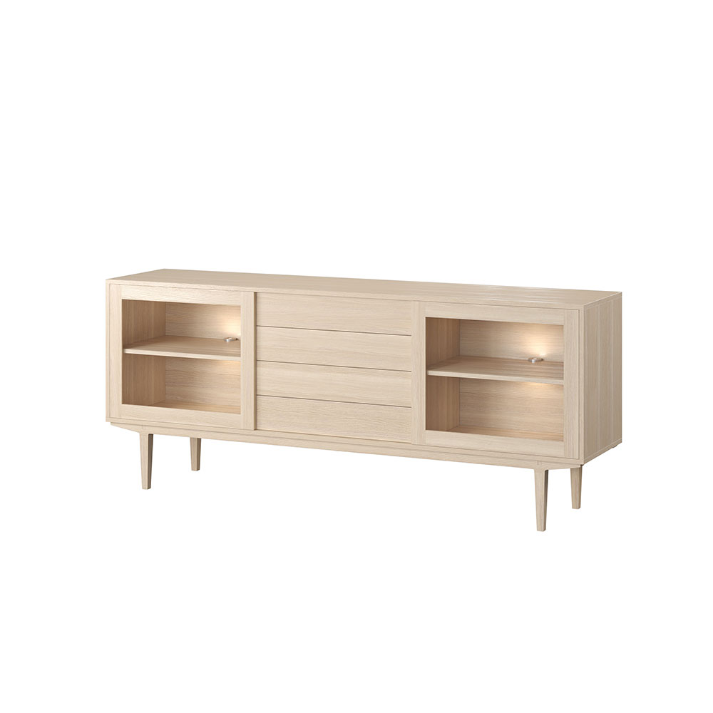 Minimalistlik ja stiilne naturaalsest puidust Caso Taani disainkapp, millel on 2 klaasist ustega riiulit ja 4 sahtlit, mis kõik sulguvad vaikselt (soft-close). Sisevalgustid eraldi tellitavad 82 €