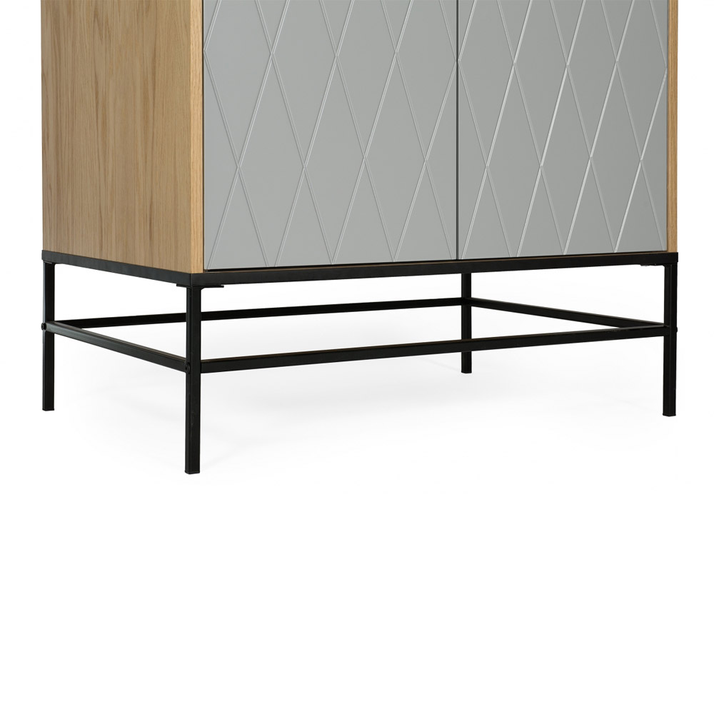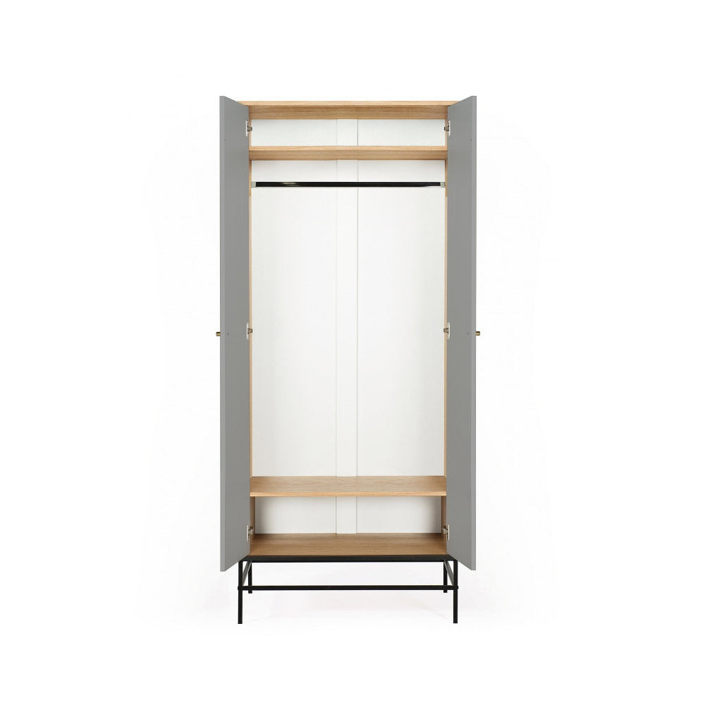 Kapil on tamme spoonist korpus. Uste taga on riidepuu ja riiul, mille kõrgus on 14,5 cm. Põhjas on üks riiul kõrgusega 21,1 cm. Jalgade kõrgus on 25 cm. Uksed ja sahtel on pehmelt sulguvad. Kapi käepidemed on valmistatud messingist.