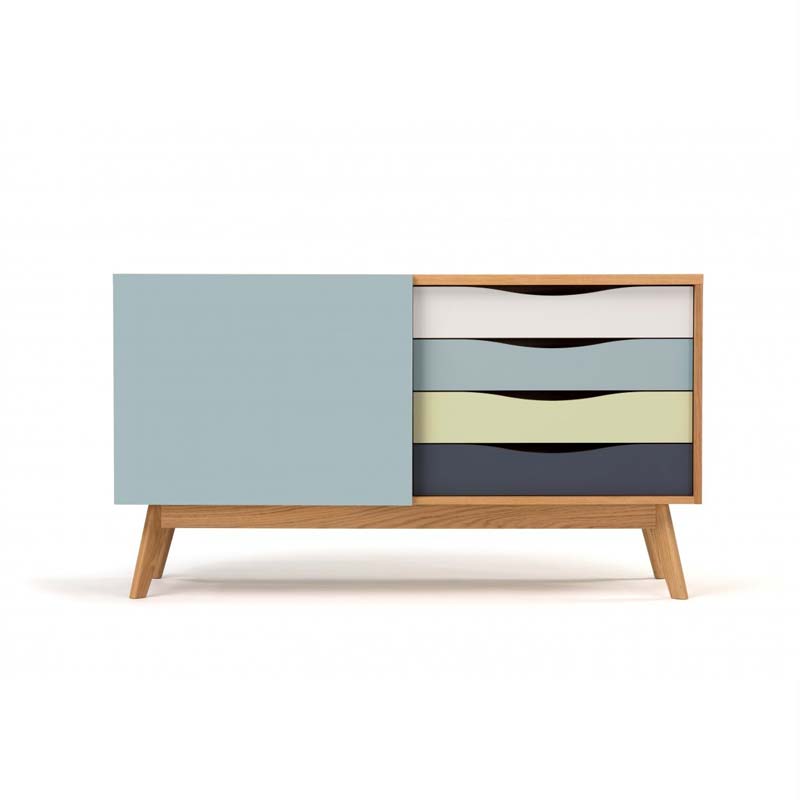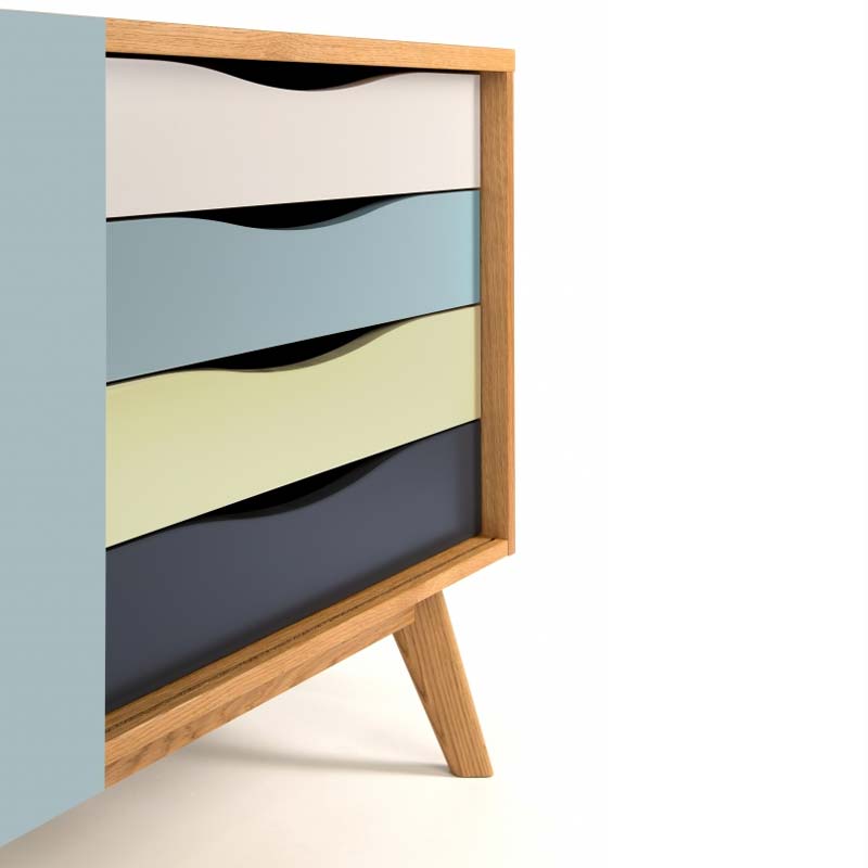 Kapiraam tammespooniga mööbliplaadist, jalad tammepuidust, sahtlid ning lükanduks värvitud melamiinplaadist.
