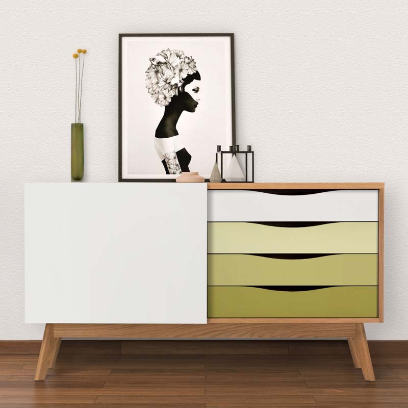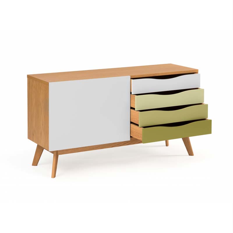 Kapiraam  tammespooniga mööbliplaadist, jalad tammepuidust, sahtlid ning lükanduks värvitud melamiinplaadist.