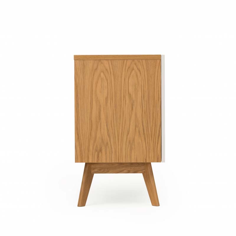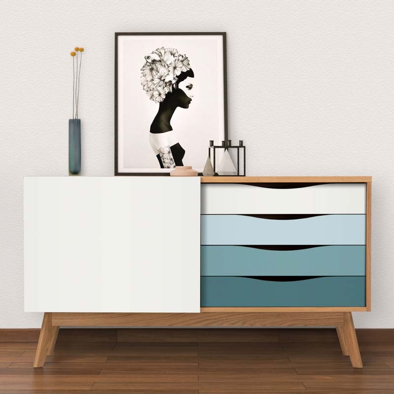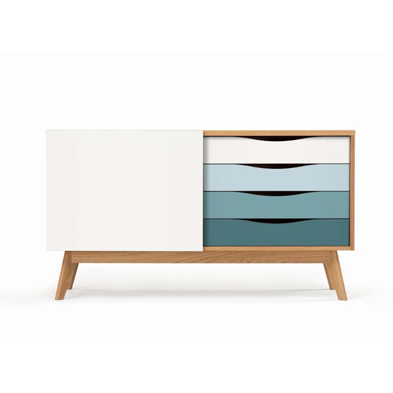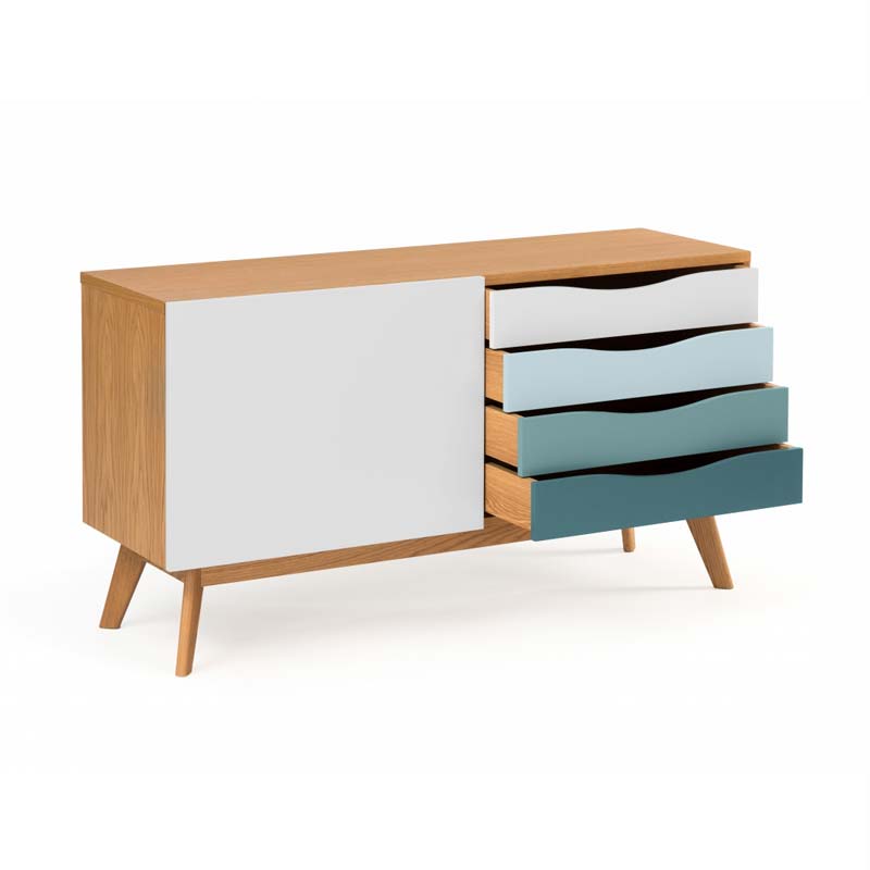 Kapiraam tammespooniga mööbliplaadist, jalad tammepuidust, sahtlid ning lükanduks värvitud melamiinplaadist.