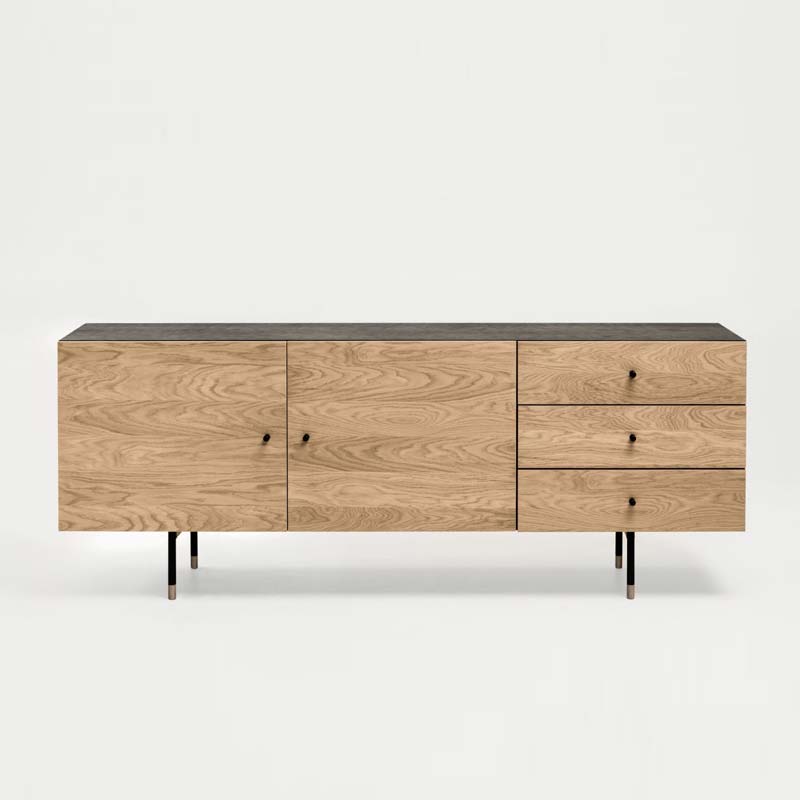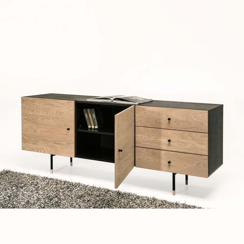 Materjal: kapiraam tammespooniga mööbliplaadist, jalad metallist ning värvitud mustaks, uksed tammespooniga.