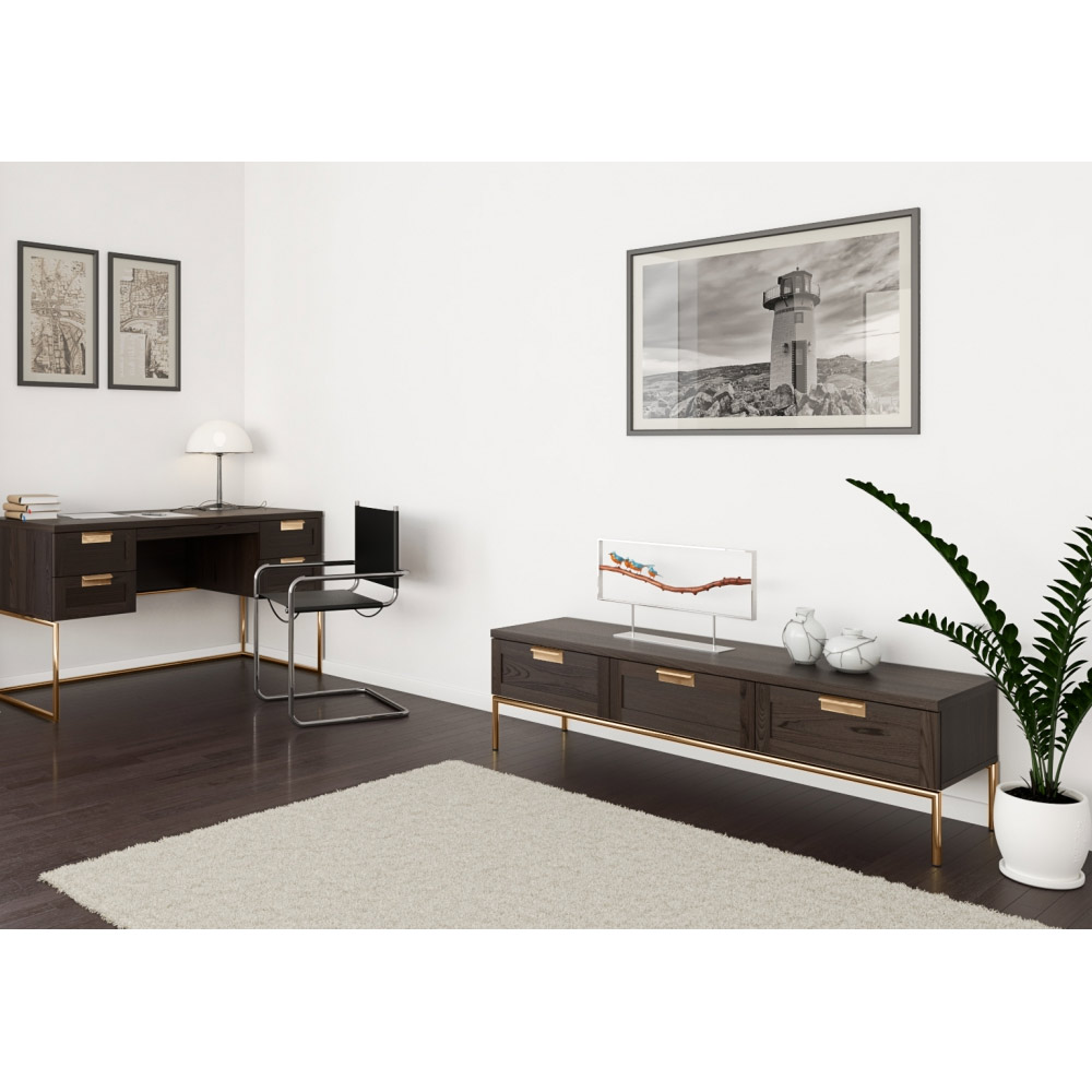 Tammevineeritud puusöega peitsitud kapp, messingist käepidemed ja jalad, pähklispooniga sahtlid ja tagasein. Šikilt elegantne valik.
