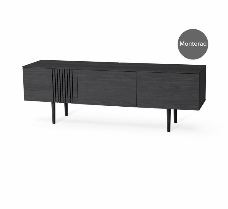 Spoonitud mustaks peitsitud tamme TV kapp kolme uksega ja puidust riiulid. Kapi saab alternatiivina ka seinale kinnitada.