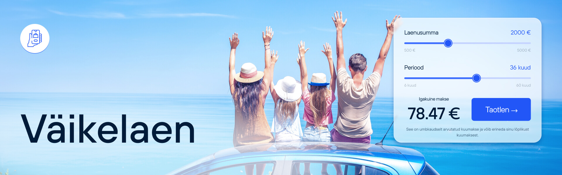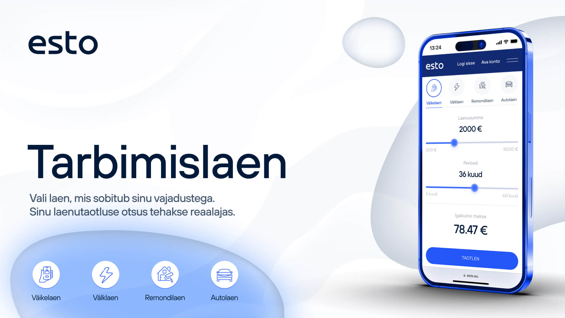 ESTO väikelaen aitab katta suuremaid väljaminekuid ning annab võimaluse saada lisaraha ootamatuteks kulutusteks. Laena kuni 5000€ ja vali endale sobiv tagasimaksegraafik 6-ks kuni 60 kuuks.